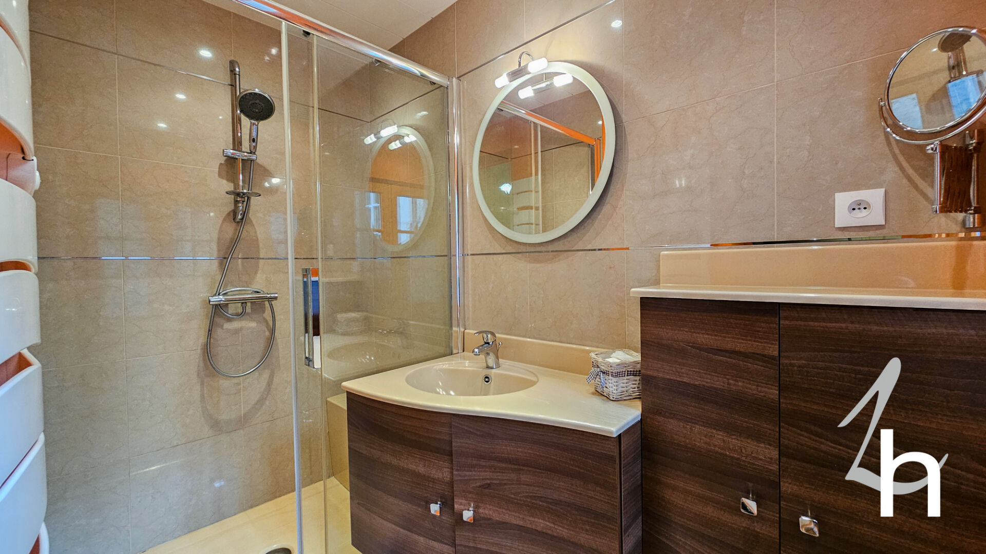 A l’étage : un palier avec un espace bureau aménagé sur mesure, 2 belles chambres avec des placards / dressing sur mesure, salle d’eau et wc séparés.