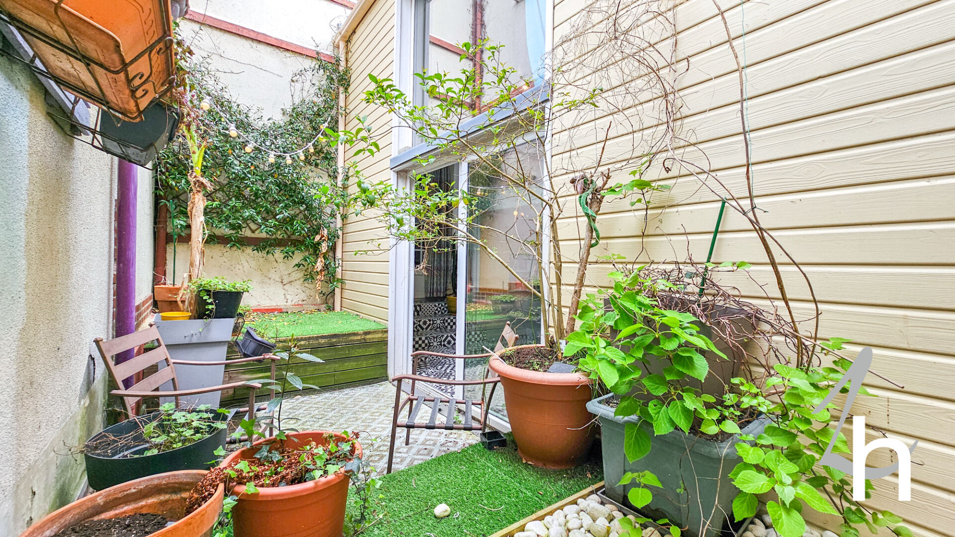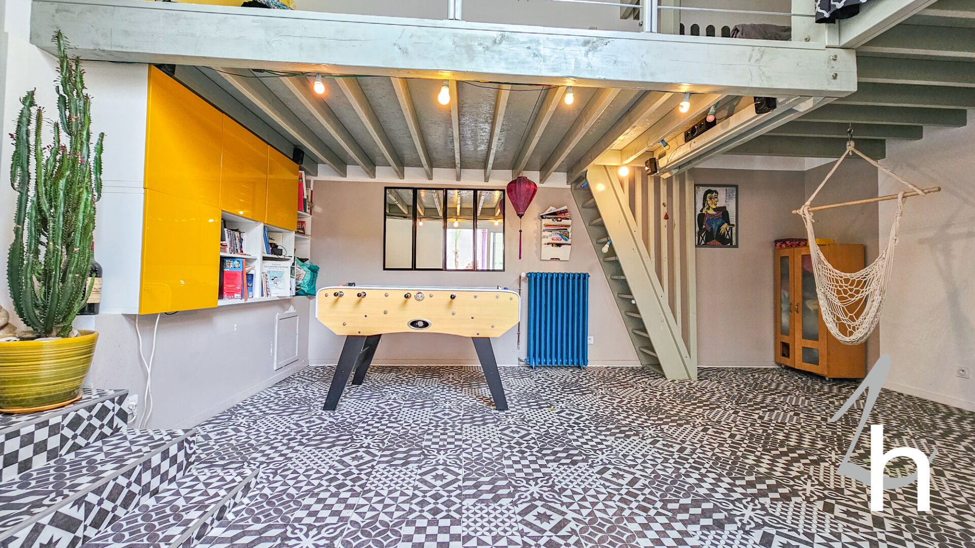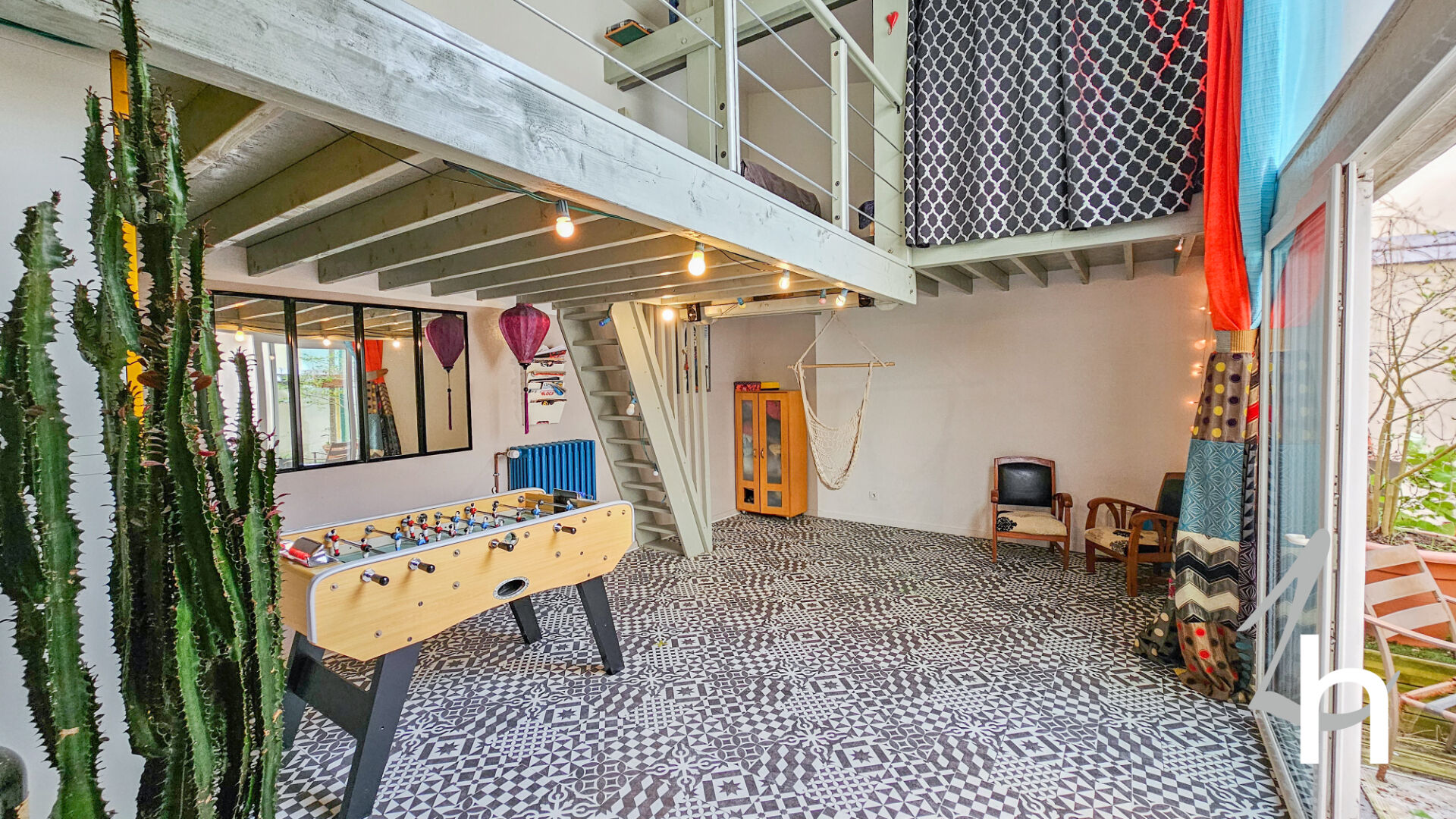 Il est composé d’une entrée, une cuisine, vaste pièce de vie avec cheminée et son parquet en pointe de hongrie, son extension offre un bel espace salon et une mezzanine / bureau -chambre, le tout donnant sur un patio au calme.
