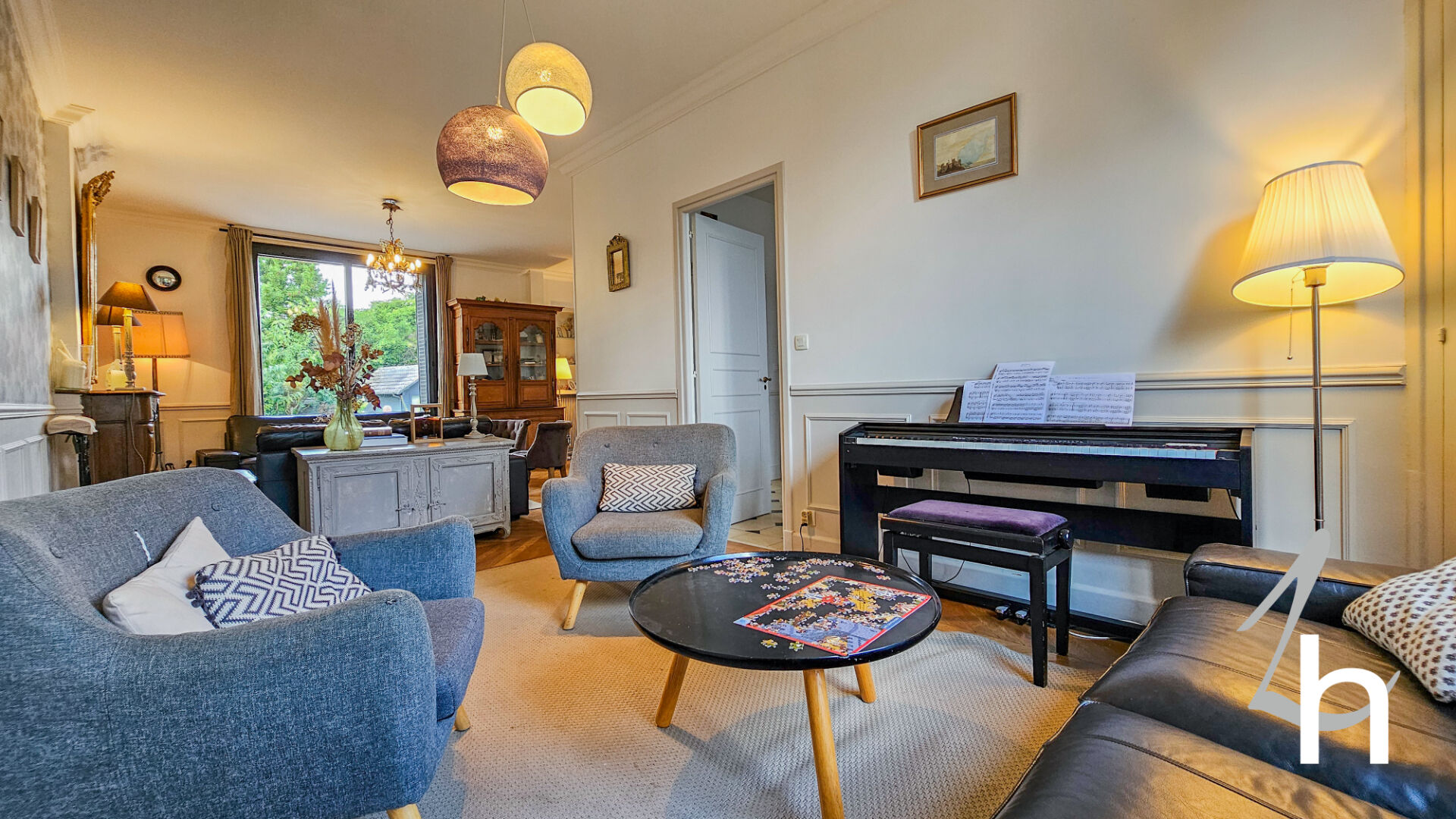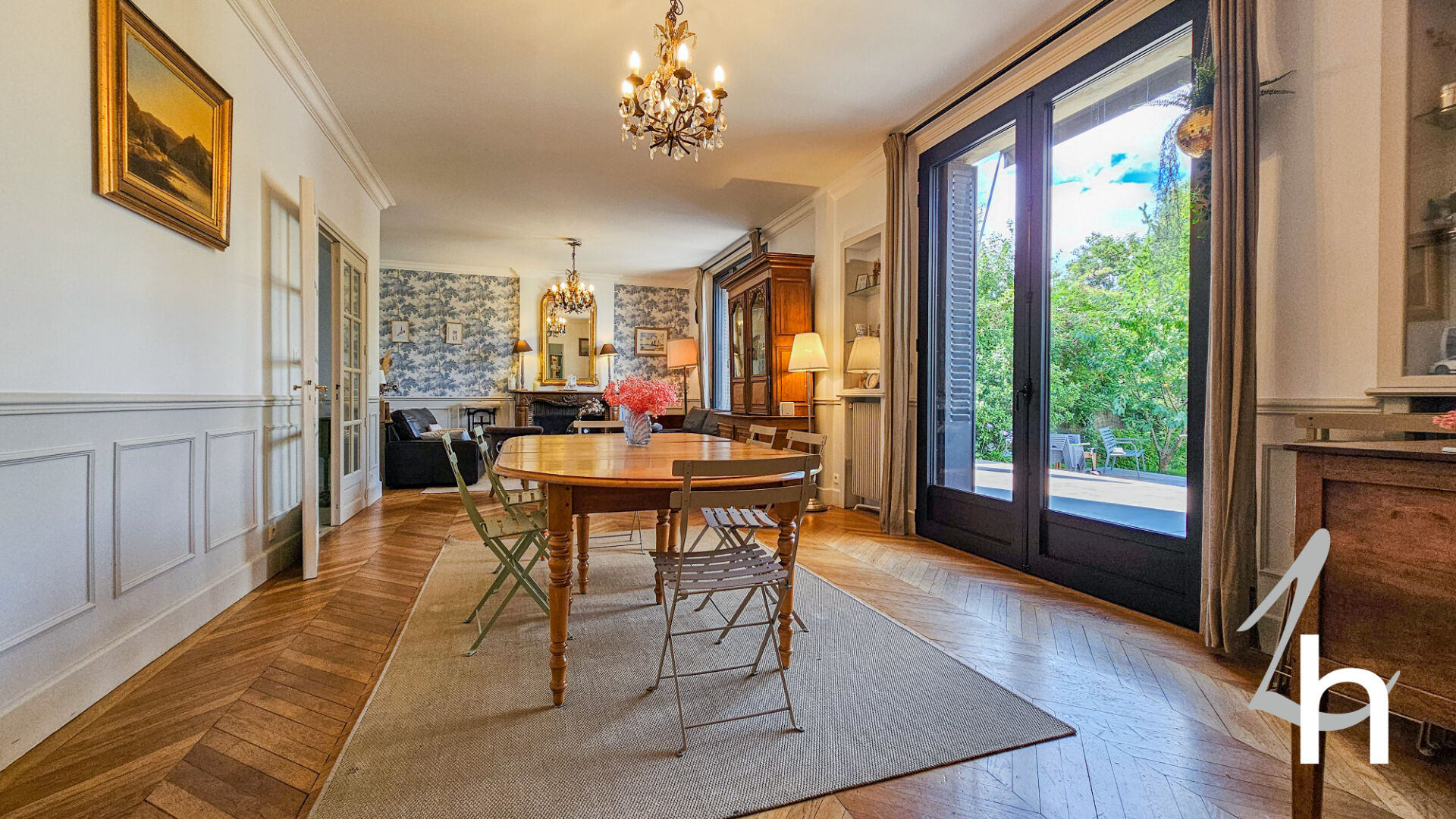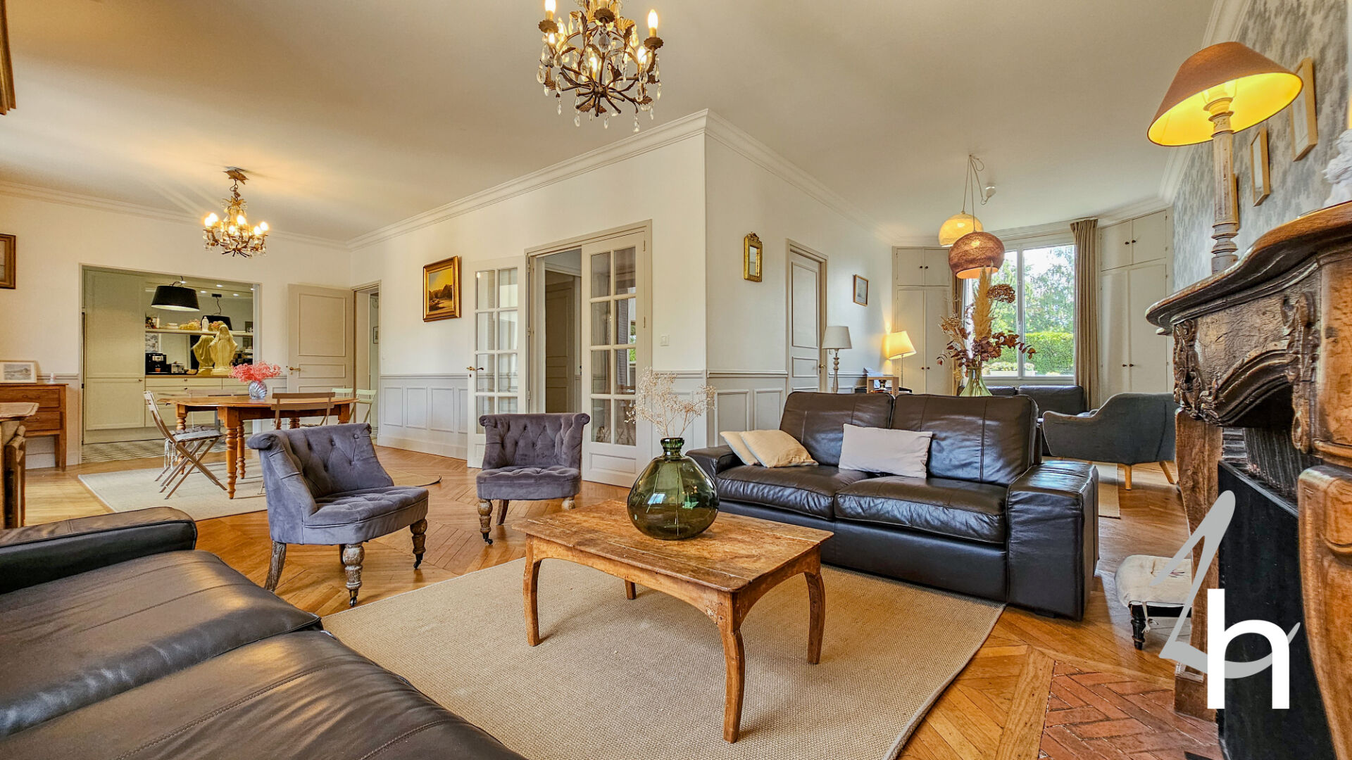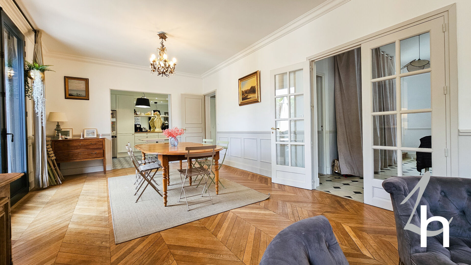 Elle est composée au rez-de-chaussée d’une entrée avec placards, vaste pièce à vivre de 79 m2 composée d’un salon / salle à manger avec sa magnifique cheminée et son parquet point de Hongrie d’origine / une grande cuisine aménagée et équipée avec son espace repas, chambre, salle de bains et WC .