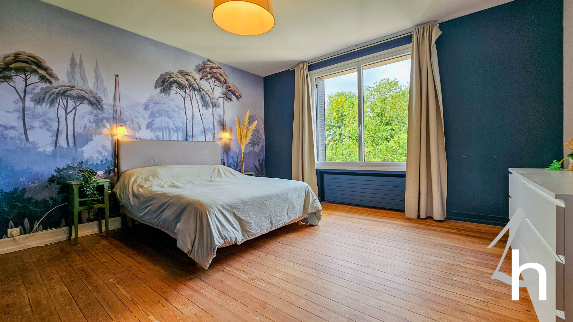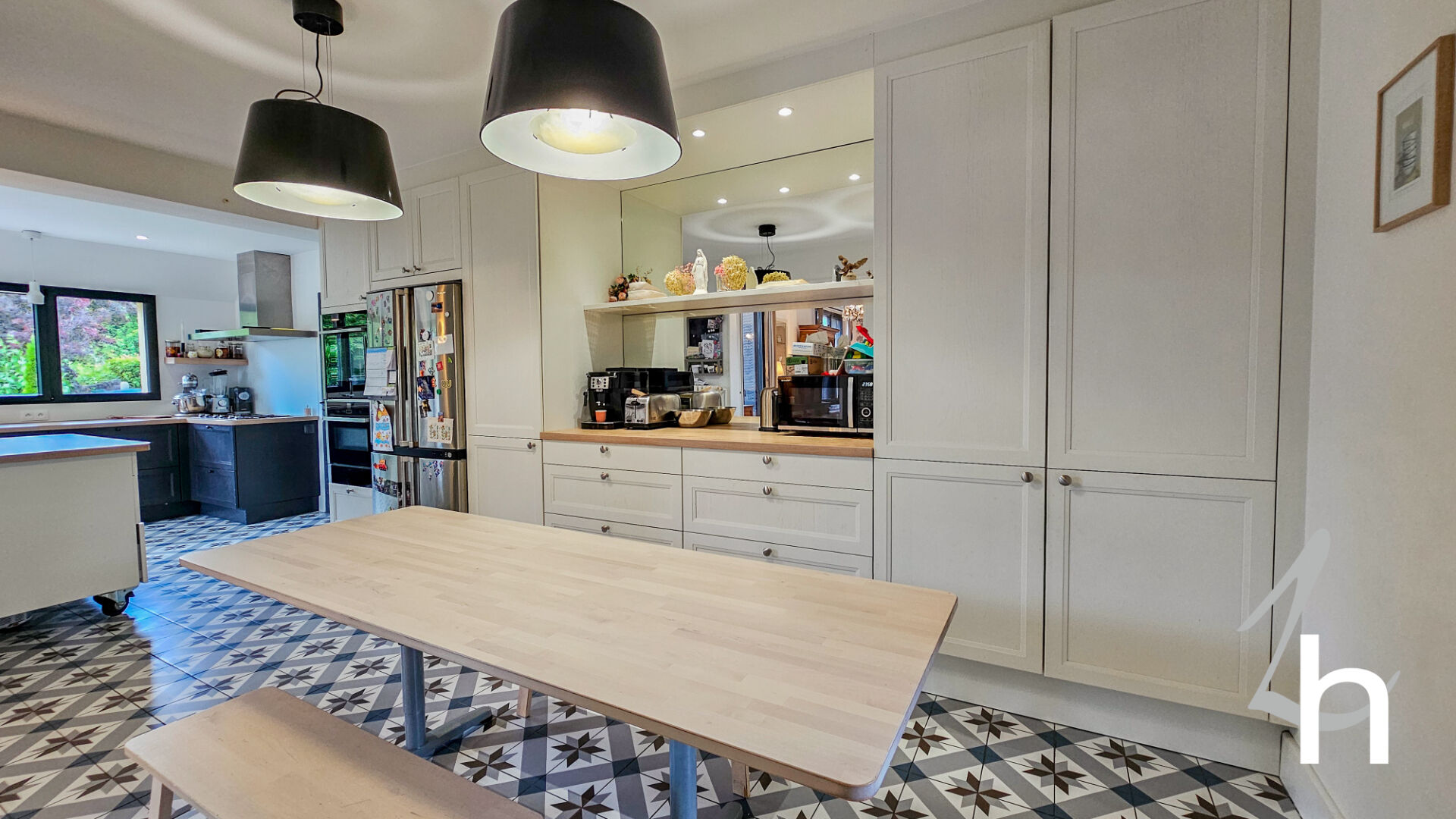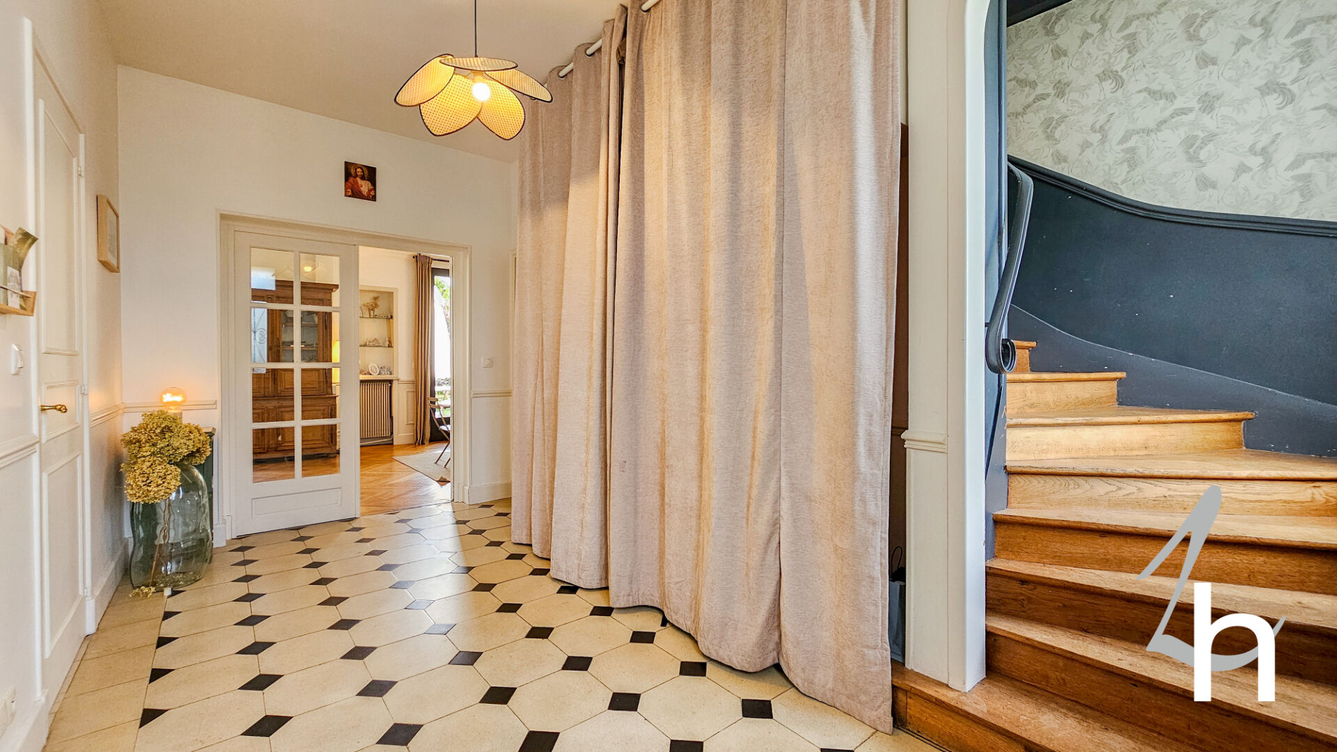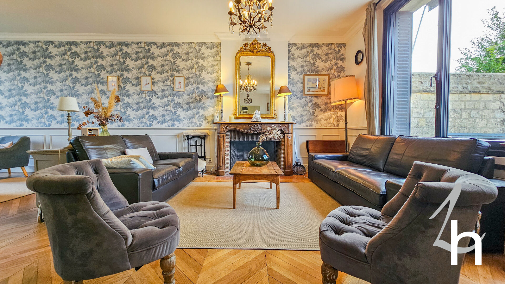Elle est composée au rez-de-chaussée d’une entrée avec placards, vaste pièce à vivre de 79 m2 composée d’un salon / salle à manger avec sa magnifique cheminée et son parquet point de Hongrie d’origine / une grande cuisine aménagée et équipée avec son espace repas, chambre, salle de bains et WC .
