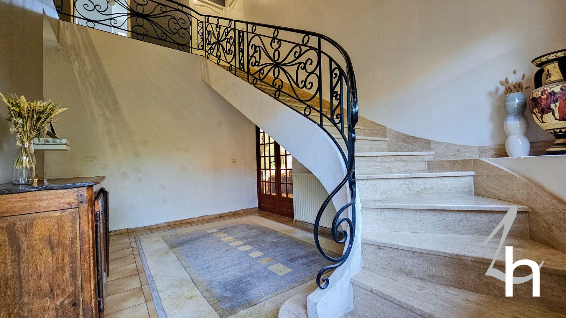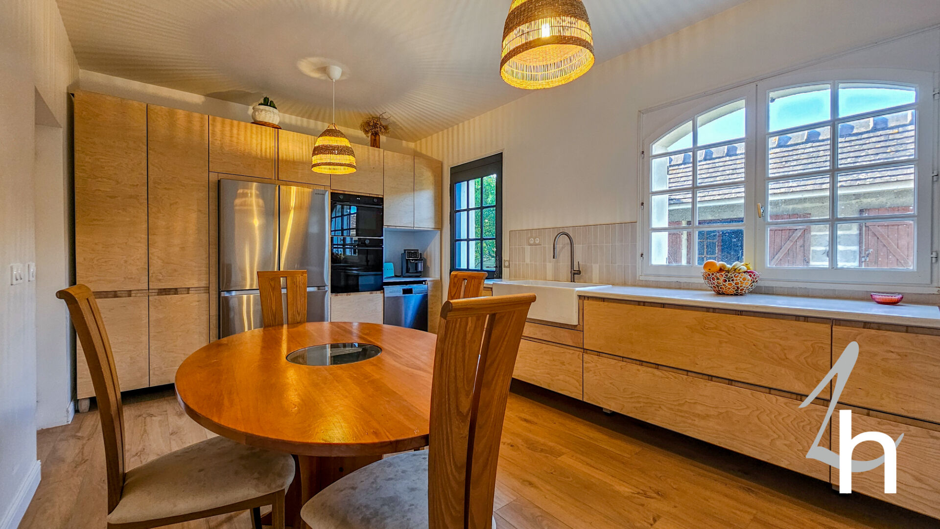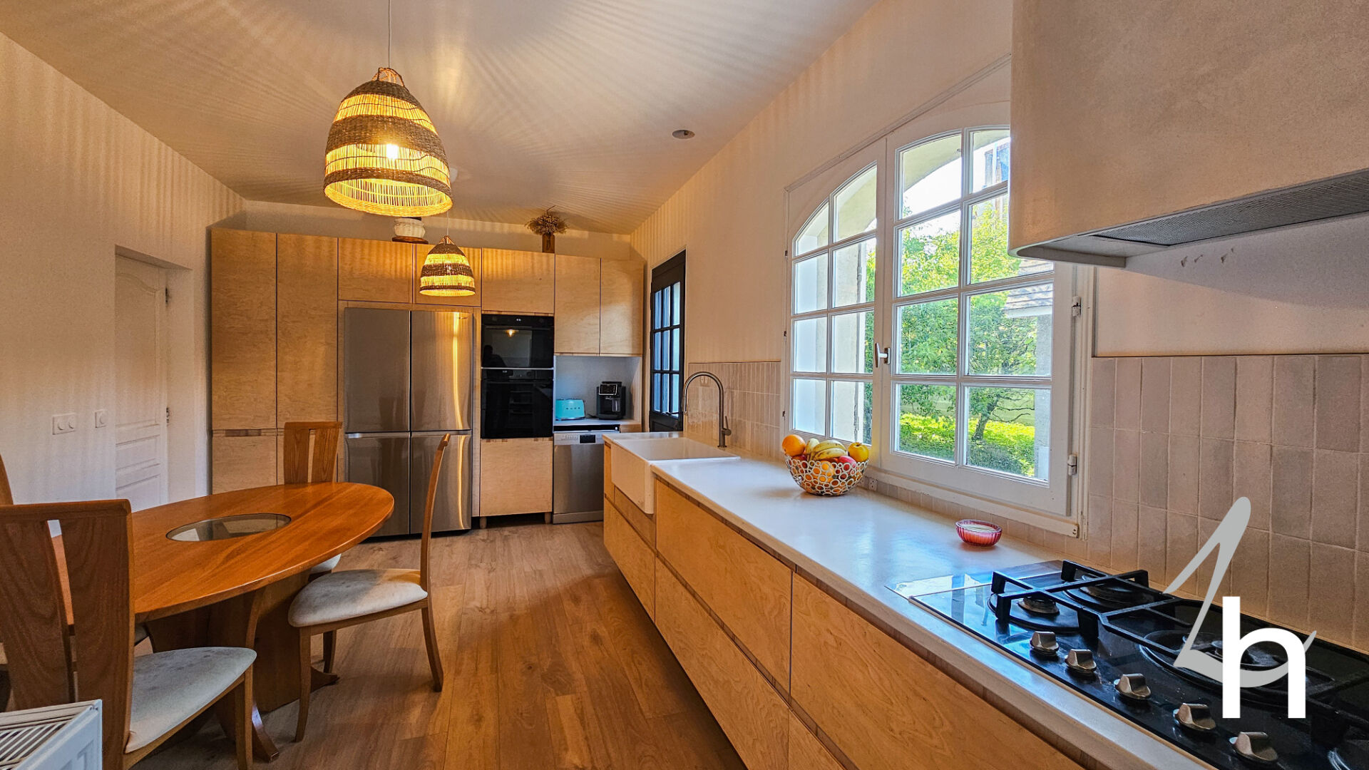 Elle est composée au rez-de-chaussée d’une entrée cathédrale, vaste pièce à vivre de 60 m2 avec salon (cheminée à double foyer) / salle à manger donnant sur la terrasse plein SUD, grande cuisine aménagée et équipée avec un espace repas, arrière cuisine, cuisine d’été de (15,84 m2), suite parentale avec salle de bains (22.48 m2), wc séparés, buanderie et lingerie.